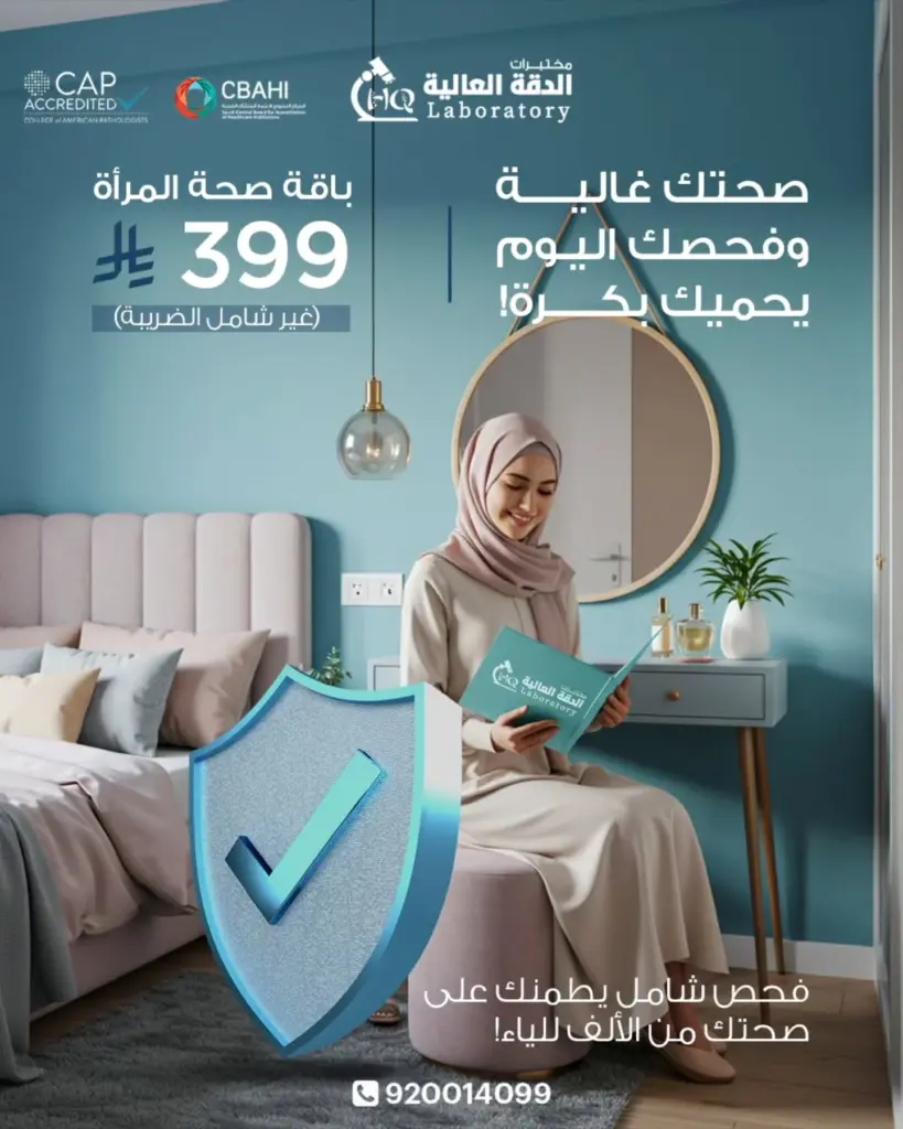 هل تبحث عن الدقة، السرعة، والاعتماد الطبي، إليك الآن مختبرات الدقة العالية التي تعتبر اختيارك الأفضل على الإطلاق، حيث نتميز باستخدام أحدث الأجهزة المعتمدة من هيئة الغذاء والدواء السعودية والأمريكية، بالإضافة إلى توفير كادر طبي مؤهل يحرص على ضمان أعلى درجات الموثوقية في النتائج، كما أن كل فحوصاتنا تخضع لرقابة صارمة لضمان الجودة، ونوفر لك إمكانية استلام النتائج ورقيًا أو إلكترونيًا، في أقصر وقت ممكن.
